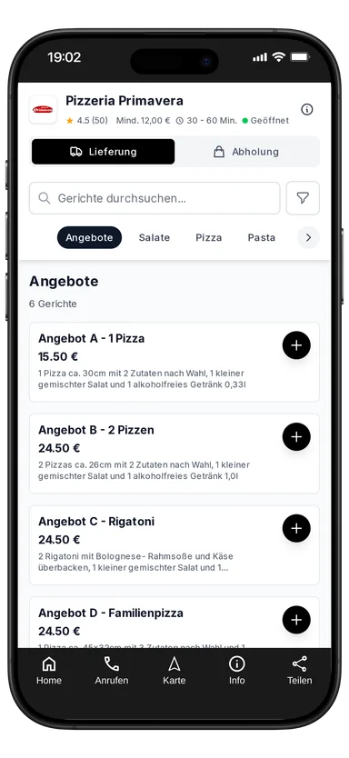 1 Pizza ca. 30cm mit 2 Zutaten nach Wahl, 1 kleiner gemischter Salat und 1 alkoholfreies Getränk 0,33l